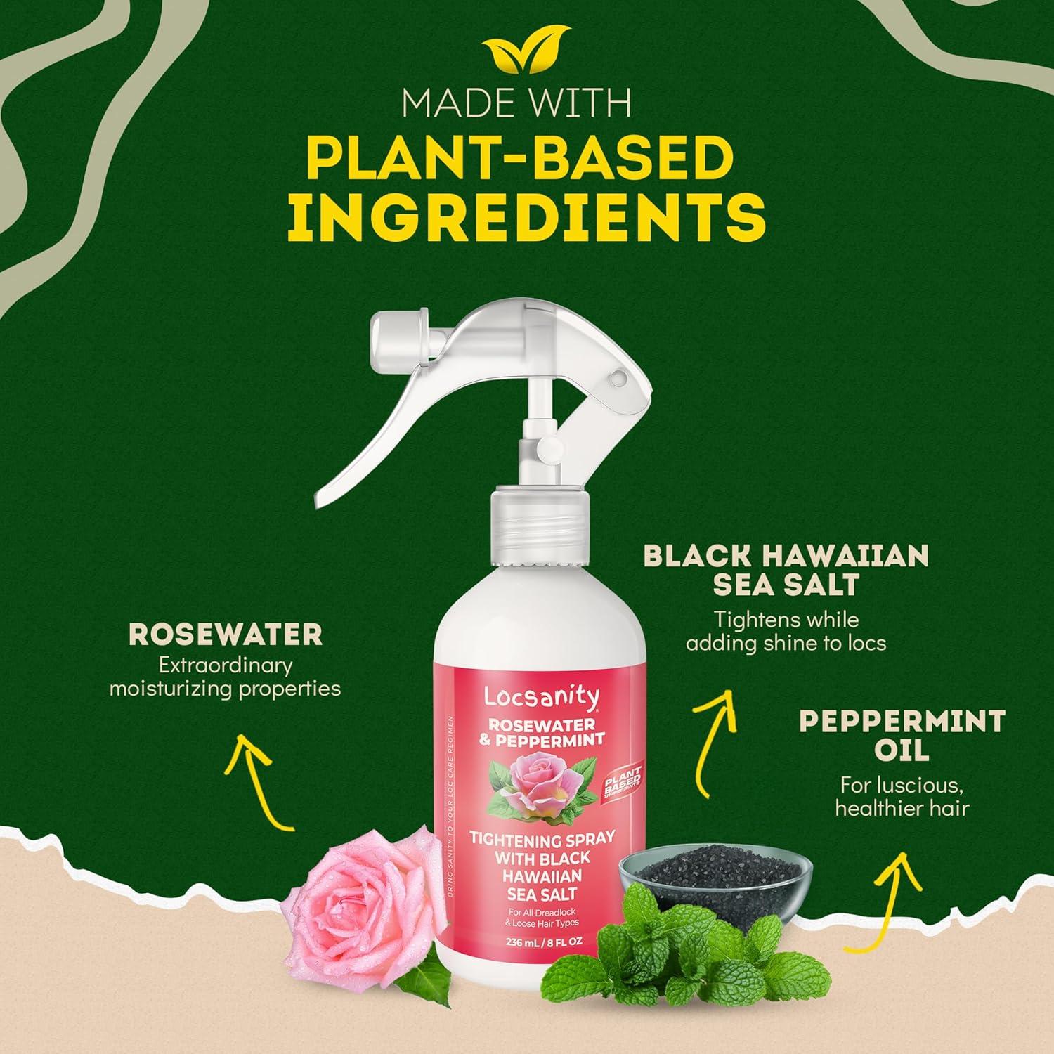 Locsanity Pure Rosewater Peppermint Loc Spray – 8oz: Moisturizing & Tightening Hydration Spray w/ Black Hawaiian Sea Salt, Plant-Based | Loc Care for All Dreadlocks & Loose Hair Types